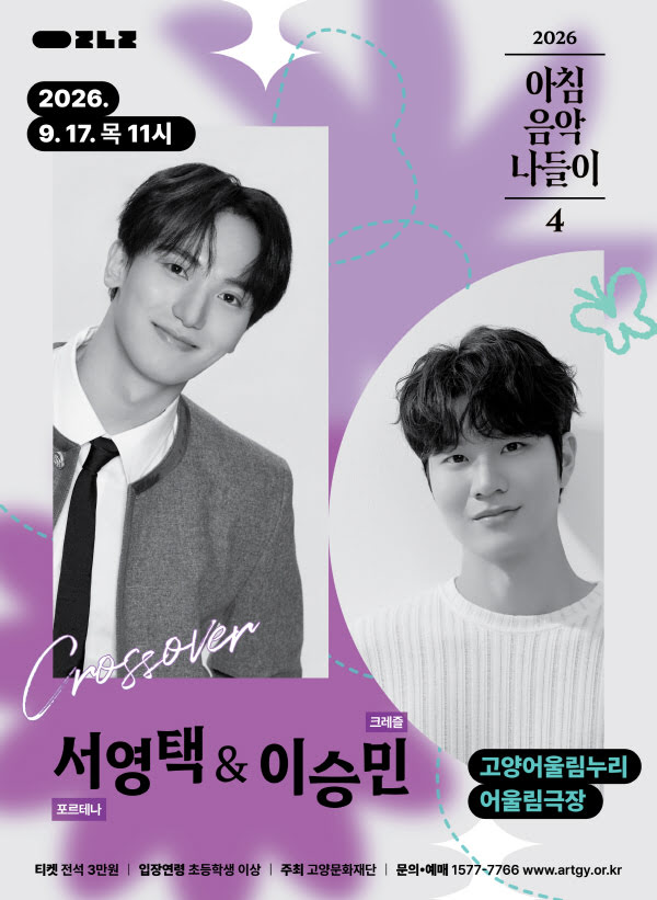 • 기간: 2026.09.17 ~ 2026.09.17 • 대상: 만 7세 이상 관람가 • 장소: 고양어울림누리 어울림극장 • 혜택: 전석 30,000원 고양어울림누리에서 기획한 아침음악나들이 시리즈의 네 번째 공연으로 서영택과 이승민이 무대를 꾸밉니다. 목요일 오전 11시에 열리는 이번 대중음악 공연은 바쁜 일상 속에서 감미로운 선율과 함께 여유로운 휴식을 즐길 수 있는 기회를 제공합니다.