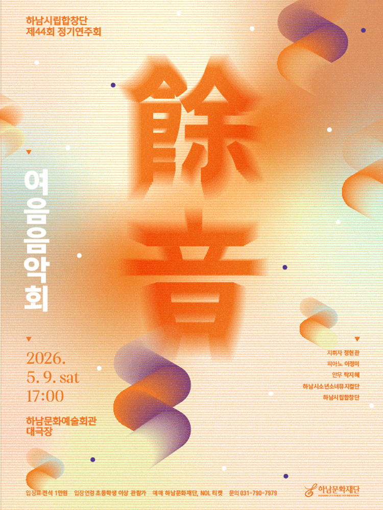 • 기간: 2026.05.09 ~ 2026.05.09 • 대상: 만 7세 이상 관람가 • 장소: 하남문화예술회관 검단홀 • 혜택: 전석 10,000원 하남시립합창단이 선보이는 제44회 정기연주회로 여음이라는 주제 아래 아름다운 합창의 선율을 선사합니다. 하남문화예술회관 대극장에서 펼쳐지는 이번 공연은 클래식 음악의 깊은 감동을 시민들에게 전달할 예정입니다. 합창단의 조화로운 목소리를 통해 따뜻한 위로와 예술적 즐거움을 경험해 보시기 바랍니다.