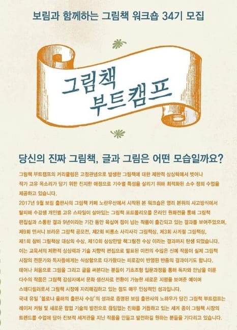 • 기간: 모집 선착순 마감, 워크숍 2026년 6월 개강 12주간 • 대상: 그림책 작가 지망생 및 초보자 • 장소: 홍대입구역 2번 출구 도보 3분 거리 • 혜택: 그림책 출간 기회와 작가 양성 과정 이 워크숍은 보림출판사가 주최하는 소수 정예 프로그램으로, 그림책 제작의 기초부터 실무 기술까지 다룹니다. 강사진이 제공하는 커리큘럼을 통해 참가자의 개성을 키우고 작품을 완성할 수 있습니다. 총 4단계 과정으로 구성되어 단계별로 성장할 기회를 제공합니다.