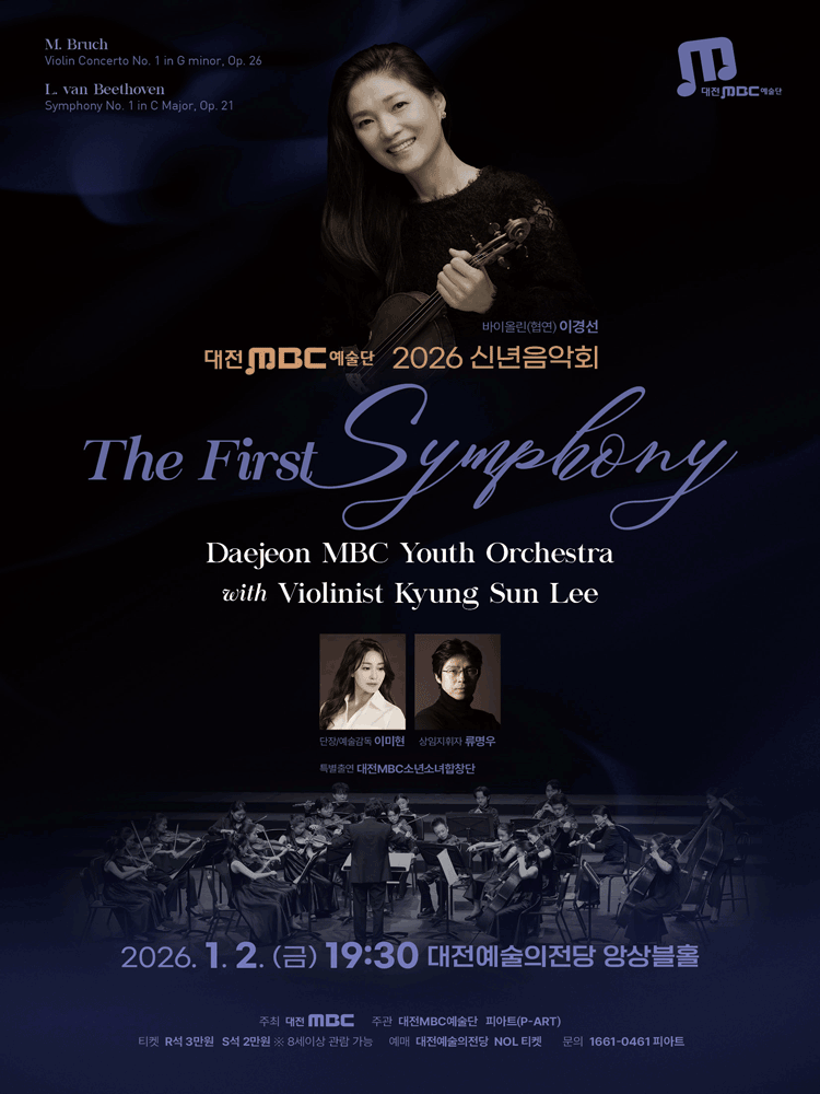 • 공연 일시: 2026년 1월 2일 (금) 19:30 • 공연 장소: 대전예술의전당 앙상블홀 • 주소: 대전광역시 서구 둔산대로 135 (만년동) • 관람 등급: 만 7세 이상 • 티켓 가격: R석 30,000원, B석 20,000원 • 장르: 서양음악(클래식) 대전MBC예술단에서 주최하는 신년음악회가 대전예술의전당에서 개최됩니다. 아름다운 클래식 선율로 새해를 맞이해보세요. 자세한 내용 및 예매는 공식 예매처를 통해 확인하시기 바랍니다.