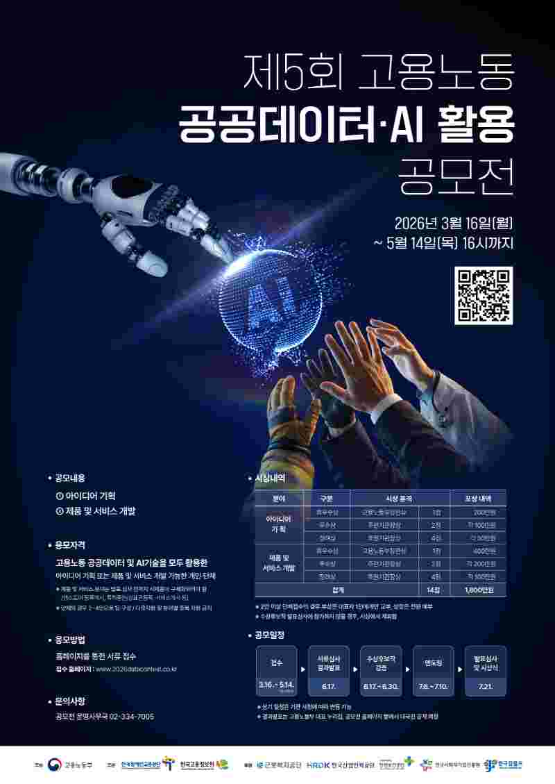 • 기간: 2026.03.16 ~ 2026.05.14 • 대상: 고용노동 공공데이터와 AI 기술 활용이 가능한 개인 또는 팀 • 장소: 공모전 누리집을 통한 온라인 접수 • 혜택: 고용노동부 장관상 시상 및 부문별 최대 400만 원 상금 고용노동 공공데이터와 인공지능 기술을 융합하여 국민 생활의 편의를 높일 수 있는 창의적인 아이디어와 서비스를 모집합니다. 아이디어 기획과 제품 및 서비스 개발 두 가지 분야로 운영되며 서류 심사를 통과한 팀에게는 전문가 멘토링 지원이 이루어집니다. 데이터 기반의 혁신적인 해결책을 제시하고 실제 서비스 구현까지 도전할 수 있는 이번 기회에 역량 있는 분들의 많은 참여를 바랍니다.