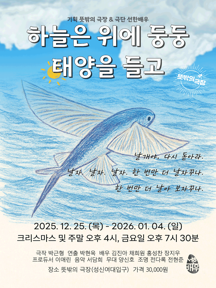 • 기간: 2025.12.25 ~ 2026.01.04 • 장소: 뜻밖의 극장(구. 해우소소극장), 서울특별시 성북구 동소문로20나길 27 (동선동1가) • 시간: 금요일 19:30, 토/일/공휴일 16:00 • 관람 등급: 전체 관람가 • 가격: 전석 30,000원 뜻밖의 극장(구. 해우소소극장)에서 연극 '하늘은 위에 둥둥 태양을 들고'가 공연됩니다. 따뜻한 연말연시, 가족과 함께 즐거운 시간을 보내세요. 자세한 정보 확인 및 예매는 공식 예매처를 통해 가능합니다.