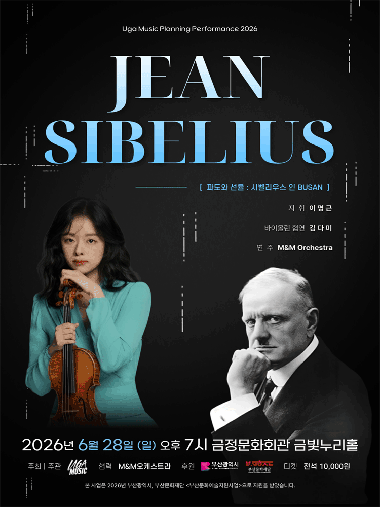 • 기간: 2026.06.28 ~ 2026.06.28 • 대상: 만 5세 이상 관람객 • 장소: 금정문화회관 대공연장(금빛누리홀) • 혜택: 전석 10,000원 관람 혜택 금정문화회관에서 기획한 작곡가 시리즈의 일환으로 핀란드의 거장 장 시벨리우스의 음악 세계를 조명하는 클래식 공연입니다. 파도와 선율이라는 주제 아래 시벨리우스 특유의 깊이 있는 선율을 합리적인 가격으로 만나보실 수 있습니다. 일요일 저녁 대공연장에서 펼쳐지는 수준 높은 연주를 통해 클래식의 감동을 느껴보시기 바랍니다.