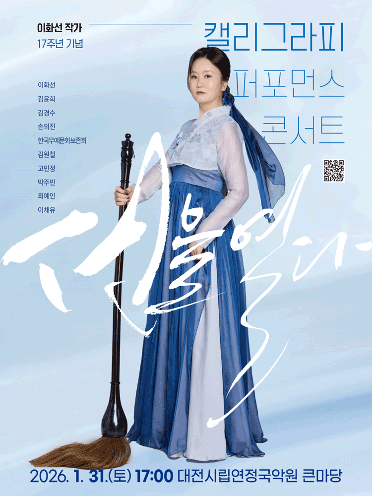 • 기간: 2026.01.31 ~ 2026.01.31 • 대상: 만 5세 이상 관람가 • 장소: 대전시립연정국악원 큰마당 • 혜택: R석 50,000원, S석 30,000원 이화선 작가의 활동 17주년을 기념하여 캘리그라피와 무대 예술이 결합된 특별한 퍼포먼스 콘서트를 개최합니다. 붓끝에서 탄생하는 역동적인 선의 아름다움을 음악과 함께 즐길 수 있는 복합 장르 공연입니다.
