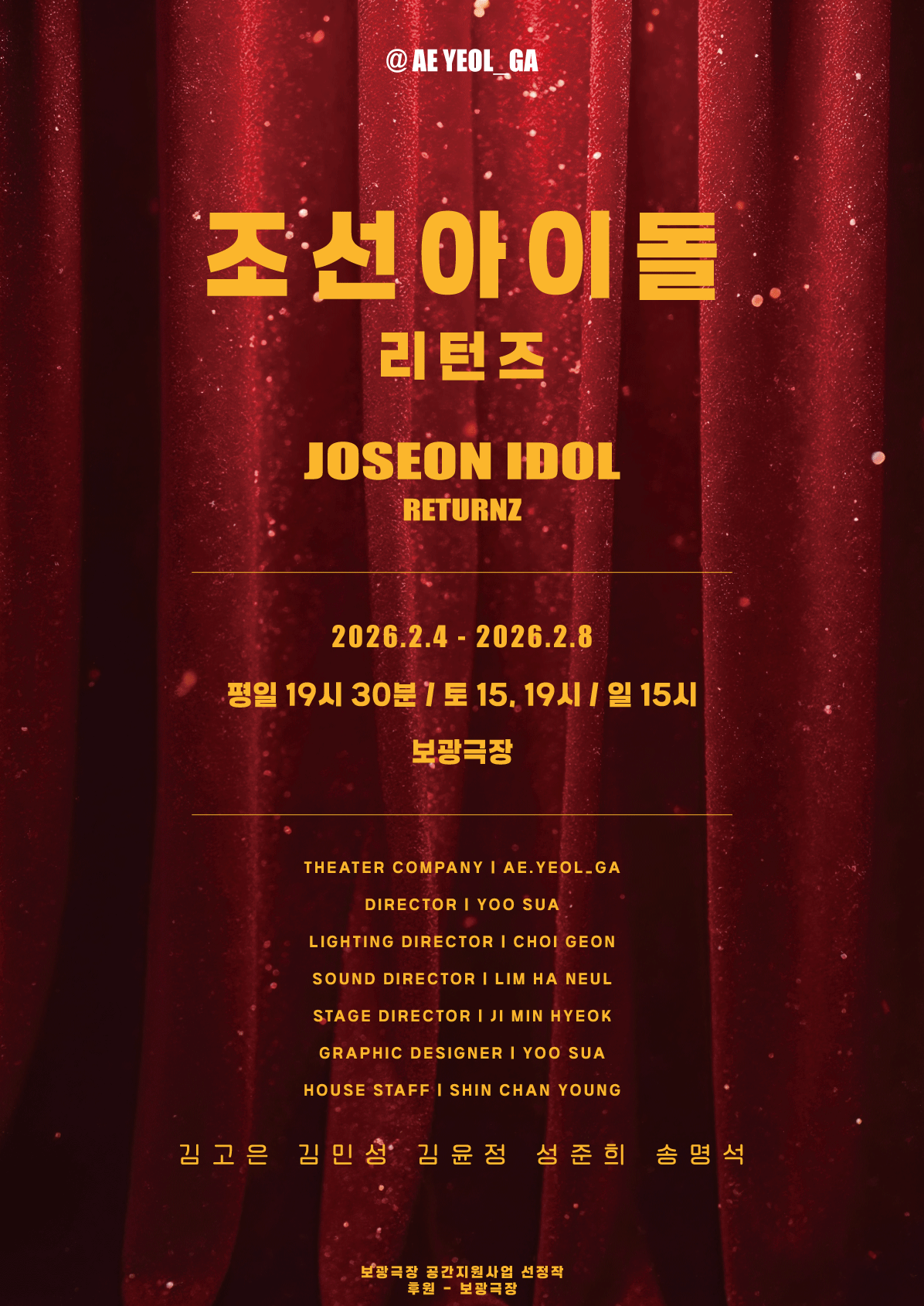 • 기간: 2026.02.04 ~ 2026.02.08 • 대상: 만 7세 이상 • 장소: 보광극장 • 혜택: 전석 30,000원 보광극장에서 펼쳐지는 연극 조선아이돌은 조선 시대를 배경으로 한 독특한 소재의 공연입니다. 평일 저녁과 주말 오후 등 다양한 시간대에 회차가 마련되어 있어 관객들이 편리하게 관람할 수 있습니다. 만 7세 이상 관람 가능한 이번 공연을 통해 색다른 연극의 재미를 느껴보시기 바랍니다.