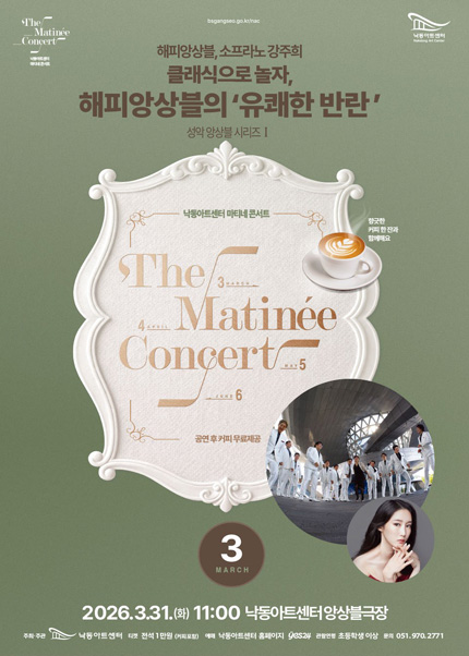 • 기간: 2026.03.31 ~ 2026.03.31 • 대상: 만 7세 이상 • 장소: 낙동아트센터 앙상블극장 • 혜택: 전석 10,000원 해피앙상블이 선보이는 유쾌한 클래식 성악 공연이 부산 낙동아트센터에서 개최됩니다. 클래식을 어렵지 않고 즐겁게 감상할 수 있도록 구성하여 관객들에게 유쾌한 반란과 같은 특별한 즐거움을 선사합니다. 평일 오전 시간을 활용해 클래식의 새로운 매력을 발견하고 힐링하는 시간을 가져보시기 바랍니다.