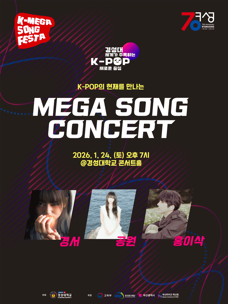 • 기간: 2026.01.24 ~ 2026.01.24 • 대상: 만 13세 이상 • 장소: 경성대학교 콘서트홀 • 혜택: 전석 88,000원 부산 경성대학교 콘서트홀에서 펼쳐지는 K-MEGA SONG 콘서트는 대중음악의 매력을 만끽할 수 있는 특별한 공연입니다. 토요일 저녁을 화려하게 장식할 이번 무대는 관객들에게 잊지 못할 감동과 즐거움을 선사할 예정입니다. 공식 예매처를 통해 티켓 예매 현황과 상세한 공연 정보를 확인할 수 있습니다.