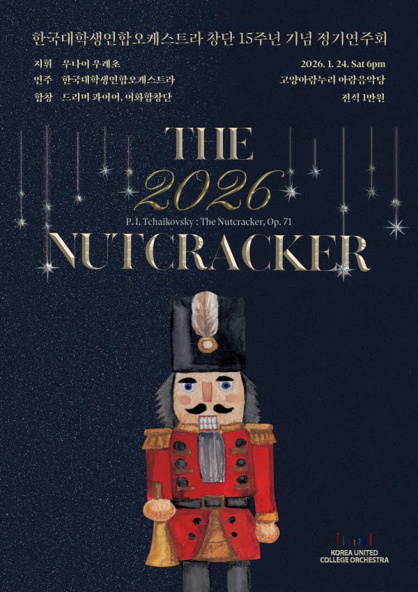 • 공연 일시: 2026년 1월 24일 (토) 18:00 • 공연 장소: 고양아람누리 아람음악당 • 관람 등급: 만 7세 이상 • 티켓 가격: 전석 10,000원 • 장르: 클래식 한국대학생연합오케스트라 창단 15주년 기념 정기연주회 정보입니다. 차이콥스키의 발레곡 '호두까기 인형'을 연주하며, 고양아람누리에서 진행됩니다. 공식 예매처를 통해 예매할 수 있습니다.