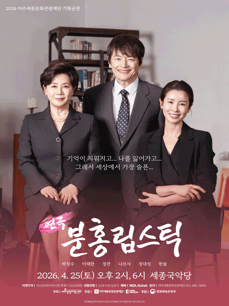 • 기간: 2026.04.25 ~ 2026.04.25 • 대상: 만 12세 이상 관람가 • 장소: 세종국악당 • 혜택: 전석 30,000원 세종국악당에서 개최되는 연극 분홍립스틱은 여주 시민과 관객들에게 감동적인 무대를 선보일 예정입니다. 토요일 오후 2시와 6시 총 2회 공연으로 진행되며 중학생 이상 연령대부터 관람이 가능합니다. 공식 예매처를 통해 티켓 예매와 상세 정보를 확인할 수 있습니다.