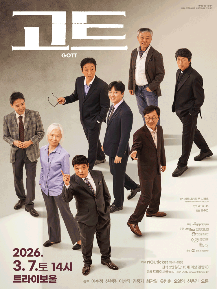 • 기간: 2026.03.07 ~ 2026.03.07 • 대상: 만 12세 이상 관람객 • 장소: 트라이보울 공연장 (2층) • 혜택: 전석 20,000원 관람권 인천 송도 트라이보울에서 펼쳐지는 연극 고트(GOTT) 공연입니다. 토요일 오후 2시에 진행되는 이번 무대는 만 12세 이상 관람 가능하며 전석 유료로 운영됩니다.