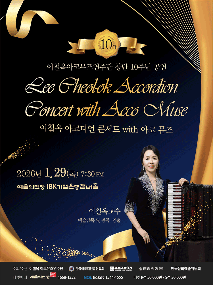 • 기간: 2026.01.29 ~ 2026.01.29 • 대상: 만 7세 이상 관람객 • 장소: 예술의전당 IBK챔버홀 • 혜택: R석 50,000원, S석 30,000원 아코디언 연주자 이철옥과 아코뮤즈가 함께하는 특별한 클래식 공연이 예술의전당에서 개최됩니다. 아코디언의 다채롭고 풍성한 음색을 통해 서양 고전 음악의 새로운 매력을 깊이 있게 전달할 예정입니다.