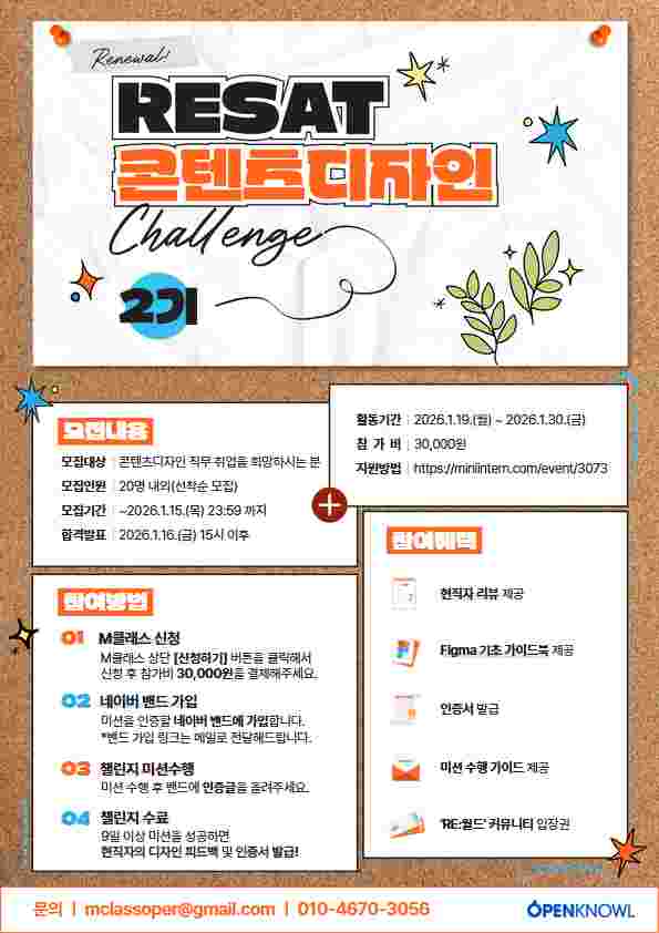 • 기간: 2026.1.19(월) ~ 2026.1.30(금) • 대상: 콘텐츠 디자인 포트폴리오 완성을 희망하는 누구나 • 혜택: 현직 디자이너 1:1 피드백, 취업 컨설팅, 포트폴리오 피드백 등 10일 동안 콘텐츠 디자이너의 실무 프로세스를 경험하고 포트폴리오를 완성하는 프로젝트입니다. 피그마 활용법 교육, 현직 디자이너의 맞춤 피드백, 취업 지원 혜택까지 제공됩니다. 10일간의 미션을 통해 포트폴리오를 완성하고 취업 역량을 강화하세요.