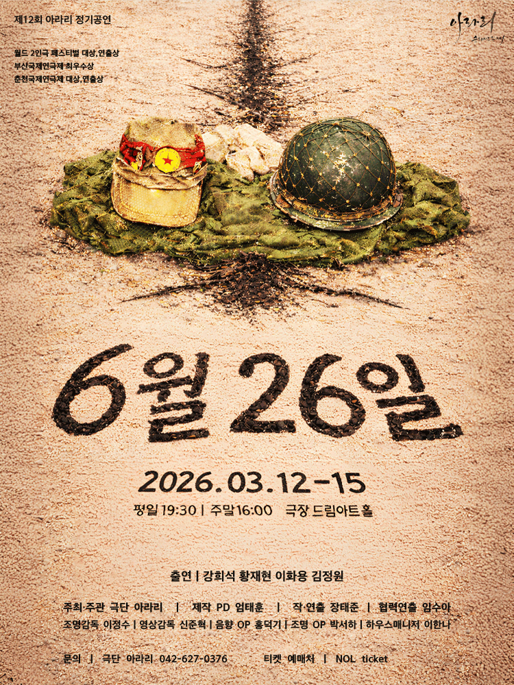 • 기간: 2026.03.12 ~ 2026.03.15 • 대상: 만 12세 이상 • 장소: 드림아트홀 [대전] • 혜택: 전석 30,000원 대전 드림아트홀에서 개최되는 연극 6월 26일의 공연 정보입니다. 평일인 목요일과 금요일은 오후 7시 30분에 시작하며 주말인 토요일과 일요일은 오후 4시에 공연이 진행됩니다. 관람을 원하시는 분들은 공식 예매처를 통해 상세 내용을 확인하시기 바랍니다.