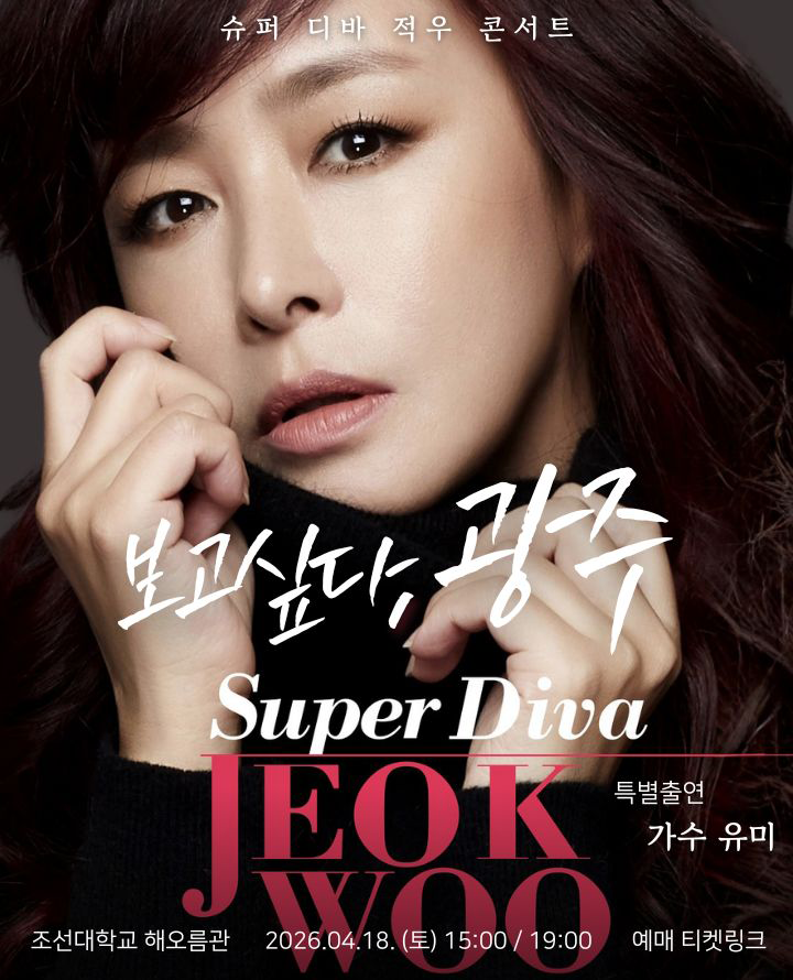 • 기간: 2026.04.18 ~ 2026.04.18 • 대상: 만 7세 이상 관람가 • 장소: 조선대학교 해오름관대강당 • 혜택: VIP석 121,000원, R석 110,000원, S석 99,000원 독보적인 음색과 가창력을 겸비한 가수 적우의 단독 공연이 광주 조선대학교에서 열립니다. 토요일 오후 3시와 7시 총 2회 공연으로 구성되어 관객들에게 깊은 감동의 무대를 선사할 예정입니다. 대중음악의 진수를 느낄 수 있는 이번 콘서트는 공식 예매처를 통해 상세 정보 확인 및 예매가 가능합니다.