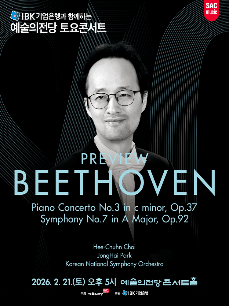 • 기간: 2026.02.21 ~ 2026.02.21 • 대상: 만 7세 이상 관람가 • 장소: 예술의전당 콘서트홀 • 혜택: 일반석 40,000원, 3층석 20,000원 예술의전당에서 개최되는 토요콘서트 시리즈로 베토벤의 주요 작품들을 감상할 수 있는 클래식 공연입니다. 전문적인 연주와 깊이 있는 해설이 어우러져 클래식 입문자부터 애호가까지 모두가 즐길 수 있는 특별한 시간을 선사합니다.