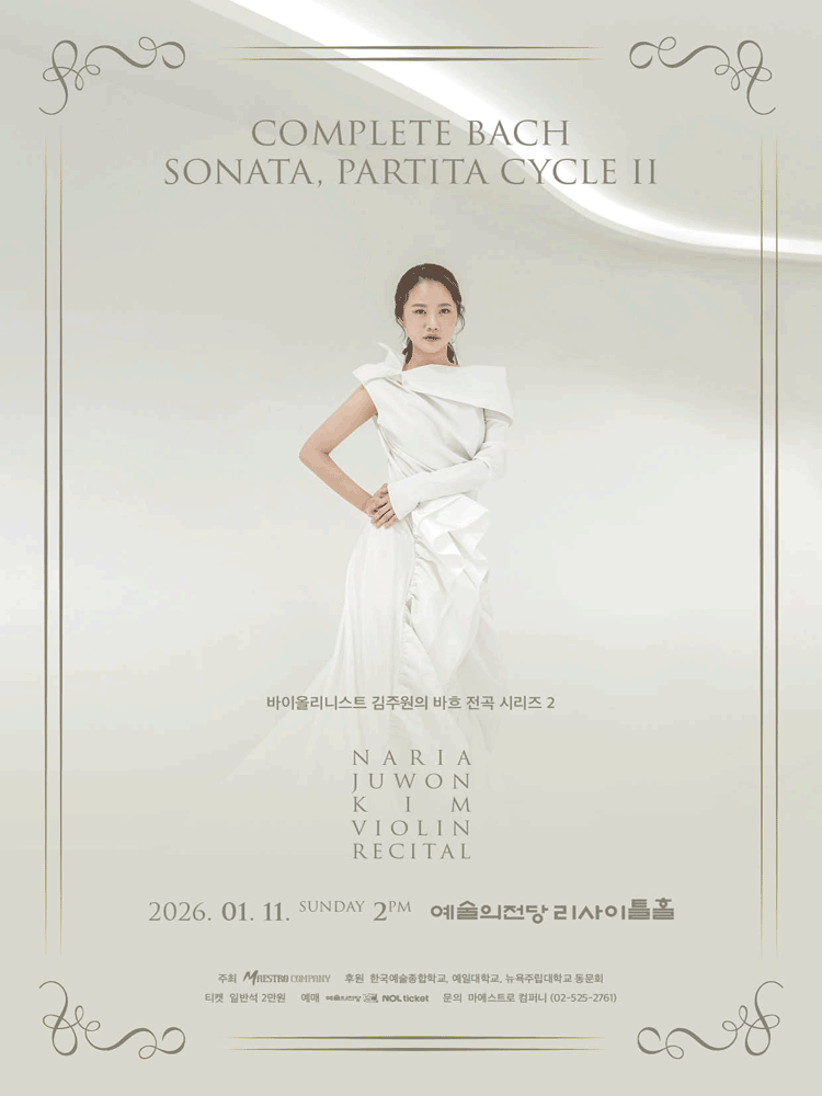 • 공연 일시: 2026년 1월 11일 (일) • 공연 시간: 14:00 • 공연 장소: 예술의전당 리사이틀홀 (서울) • 관람 등급: 만 7세 이상 • 티켓 가격: 전석 20,000원 • 장르: 클래식 바이올리니스트 김주원의 바흐 전곡 시리즈 두 번째 공연이 예술의전당에서 열립니다. KOPIS 공식 정보를 참고하여 예매처를 통해 상세 내용을 확인하고 예매하시기 바랍니다.