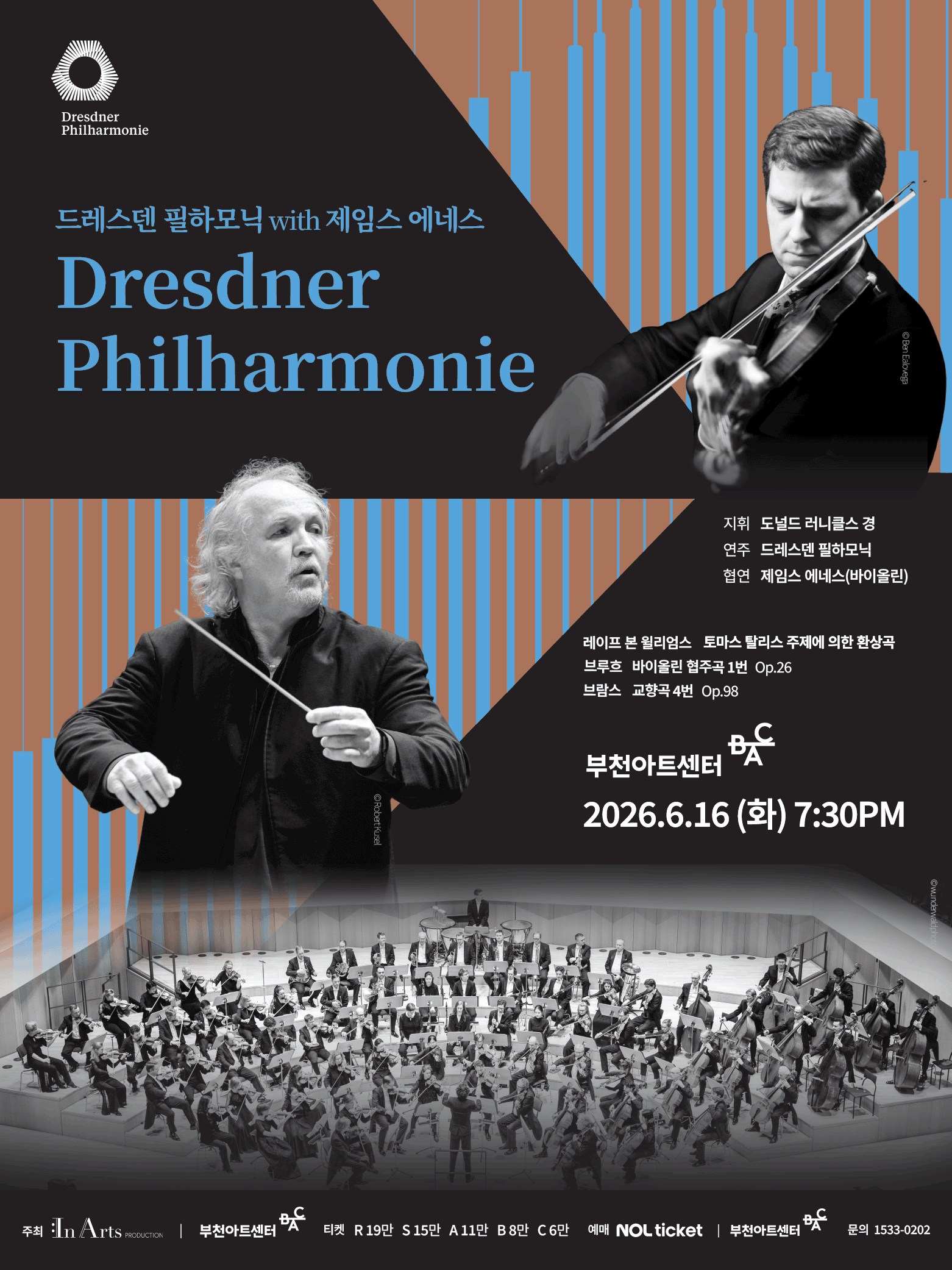 • 기간: 2026.06.16 ~ 2026.06.16 • 대상: 만 7세 이상 • 장소: 부천아트센터 콘서트홀 • 혜택: 좌석 등급별 티켓 예매 (60,000원~190,000원) 독일의 유서 깊은 드레스덴 필하모닉과 세계적인 바이올리니스트 제임스 에네스가 부천에서 협연을 펼칩니다. 정통 클래식의 정수를 느낄 수 있는 이번 공연은 부천아트센터의 뛰어난 음향 시설과 어우러져 관객들에게 깊은 울림을 전할 예정입니다.