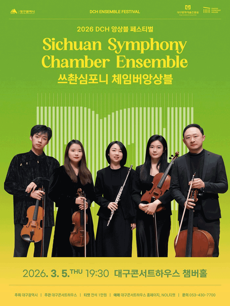 • 기간: 2026.03.05 ~ 2026.03.05 • 대상: 만 7세 이상 관람객 • 장소: 대구콘서트하우스 챔버홀 • 혜택: 전석 10,000원 관람 혜택 대구콘서트하우스에서 개최되는 이번 공연은 쓰촨심포니 체임버앙상블의 수준 높은 클래식 연주를 감상할 수 있는 기회입니다. 앙상블 페스티벌의 일환으로 진행되며 합리적인 가격으로 정통 서양음악의 정수를 경험할 수 있습니다.