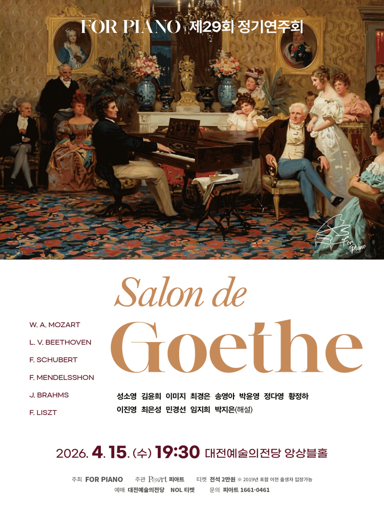• 기간: 2026.04.15 ~ 2026.04.15 • 대상: 만 7세 이상 • 장소: 대전예술의전당 앙상블홀 • 혜택: 전석 20,000원 대전예술의전당에서 열리는 제29회 포피아노 정기연주회는 클래식 음악의 정수를 느낄 수 있는 공연입니다. 피아노 앙상블의 다채로운 선율을 감상할 수 있으며 전석 동일한 가격으로 관람이 가능합니다. 2026년 4월 15일 저녁 대전에서 펼쳐지는 아름다운 선율의 무대를 만나보시기 바랍니다.