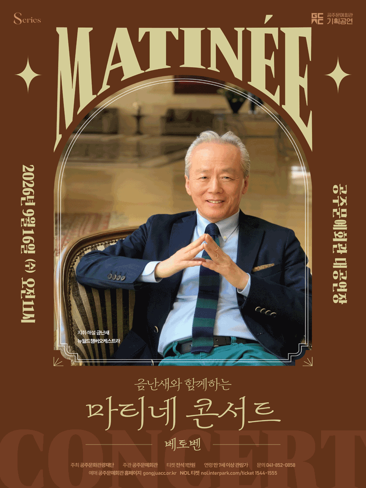 • 기간: 2026.09.16 ~ 2026.09.16 • 대상: 만 7세 이상 관람객 • 장소: 공주문예회관 대공연장 • 혜택: 전석 10,000원 관람 혜택 지휘자 금난새의 친절한 해설과 함께 베토벤의 클래식 음악을 깊이 있게 만나는 공연입니다. 평일 오전 11시에 진행되는 마티네 콘서트로 일상 속에서 여유롭게 고품격 연주를 감상할 수 있습니다.