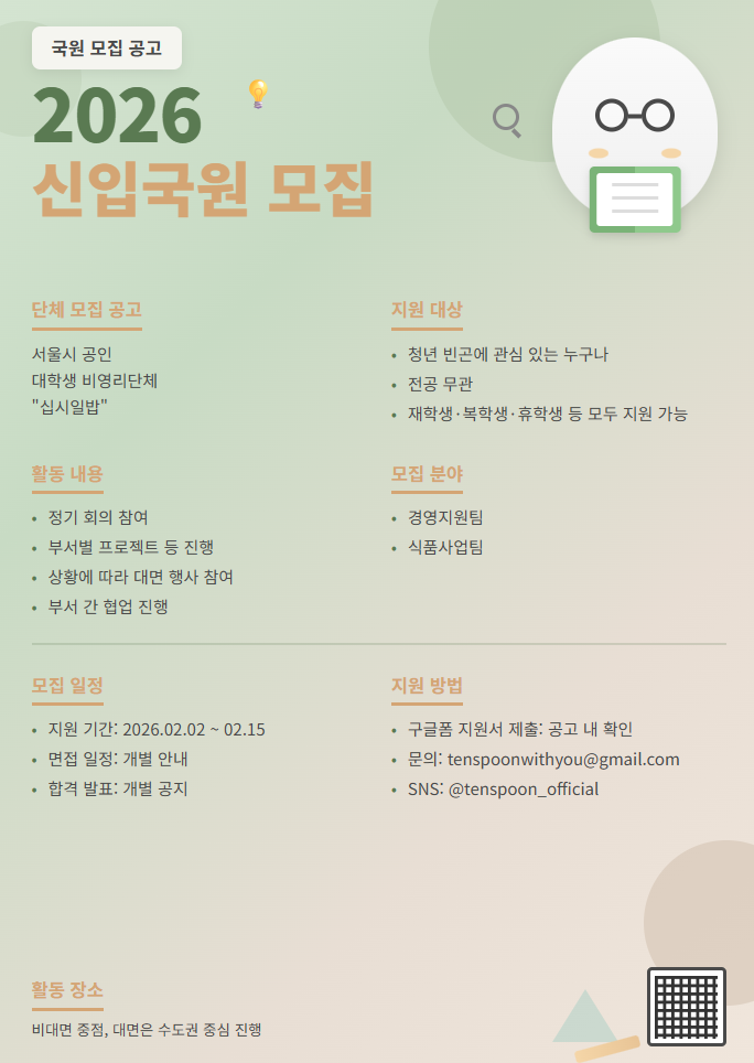 • 기간: 2026년 2월 2일 ~ 2026년 2월 15일 • 대상: 전국의 모든 대학생 (재학, 휴학, 졸업생 포함) • 장소: 수도권 중심 대면 및 비대면 활동 병행 • 혜택: 활동 수료증 발급 및 실무 협업 툴 활용 경험 제공 청년 빈곤 문제 해결을 위해 활동하는 비영리 민간 단체 십시일밥에서 식품사업과 경영지원 분야의 신입 국원을 모집합니다. 선발된 인원은 식권 나눔 프로젝트 운영이나 조직 관리 및 문화 기획 등 실무 중심의 활동을 1년간 수행하게 됩니다. 실제 기업에서 사용하는 협업 툴을 활용하며 사회적 가치를 실현하고 차별화된 포트폴리오를 쌓을 수 있는 기회입니다.