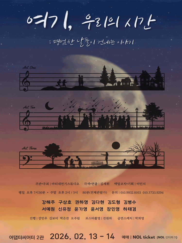• 기간: 2026.02.13 ~ 2026.02.14 • 대상: 전체 관람가 • 장소: 어댑터씨어터 2관 • 혜택: 전석 30,000원 부산 어댑터씨어터에서 펼쳐지는 이번 연극은 평범한 일상 속 소중한 순간들을 무대 위에 담아냅니다. 금요일 저녁과 토요일 오후 총 세 차례 공연이 진행되며 전 연령층이 함께 즐길 수 있는 따뜻한 이야기를 선사합니다.