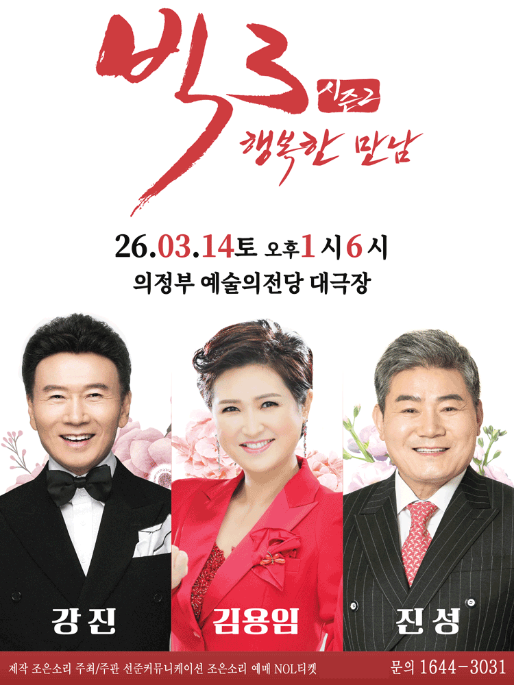 • 기간: 2026.03.14 ~ 2026.03.14 • 대상: 만 7세 이상 관람객 • 장소: 의정부예술의전당 대극장 • 혜택: VIP석 132,000원, R석 110,000원, S석 88,000원 대한민국 트로트계를 대표하는 가수 강진, 김용임, 진성이 함께하는 빅3 시즌2 콘서트가 의정부에서 개최됩니다. 세 명의 거장이 선사하는 화려한 무대와 깊은 감동의 노래를 한자리에서 감상할 수 있는 특별한 기회입니다. 토요일 오후와 저녁 총 2회 공연으로 진행되어 온 가족이 함께 즐거운 시간을 보낼 수 있습니다.